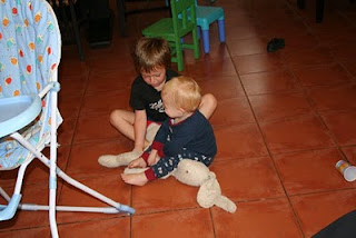 And then one day, a few weeks ago, after Emilia's arrival into the world (where Ben became an older brother), we saw "The Battle of The Rabbit". I was taking pictures of Emmy in the kitchen and noticed in the background that Ben was sitting on Nini. He was loving life and killing himself laughing with his latest coup. Jake saw this and lost the plot. I'll let the pictures below explain the rest....